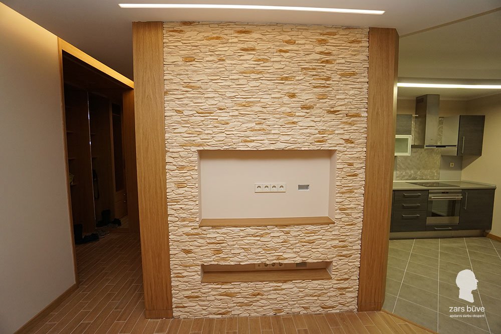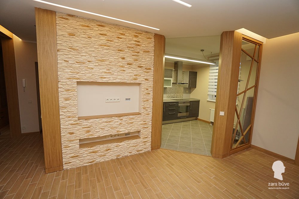 Šī dzīvokļa remonts bija interesants ar to, ka esošajos kvadrātmetros vajadzēja mainīt plānojumu, uzbūvējot vēl vienu papildu izolētu istabu. Pateicoties profesionālam projektētāja darbam, mūsdienīgiem tehniskajiem risinājumiem un mūsu celtnieku meistarībai, šo uzdevumu izdevās paveikt lieliski. Rezultātā dzīvoklis ieguva ne tikai papildu istabu, bet arī saunu, nezaudējot plašumu un uzlabojot funkcionalitāti. Dzīvokļa siltais, zeltainais interjers papildināts ar radošiem un moderniem apgaismojuma risinājumiem, radot vidi, kurā ir ērti un patīkami uzturēties.