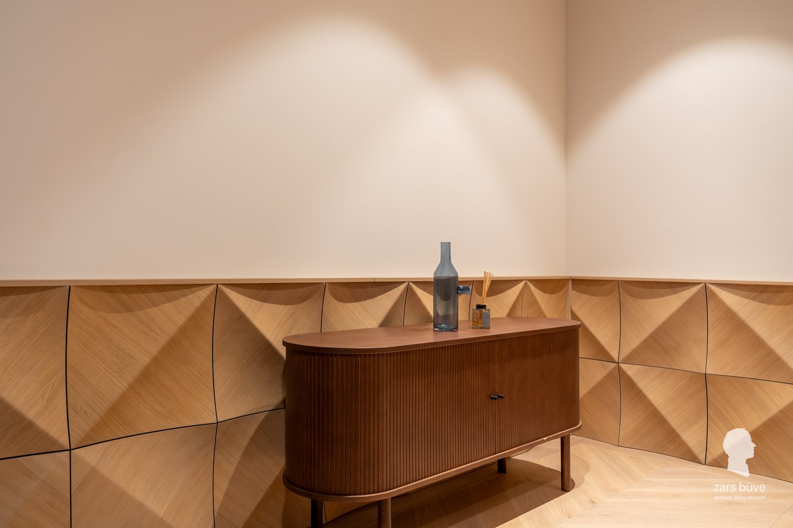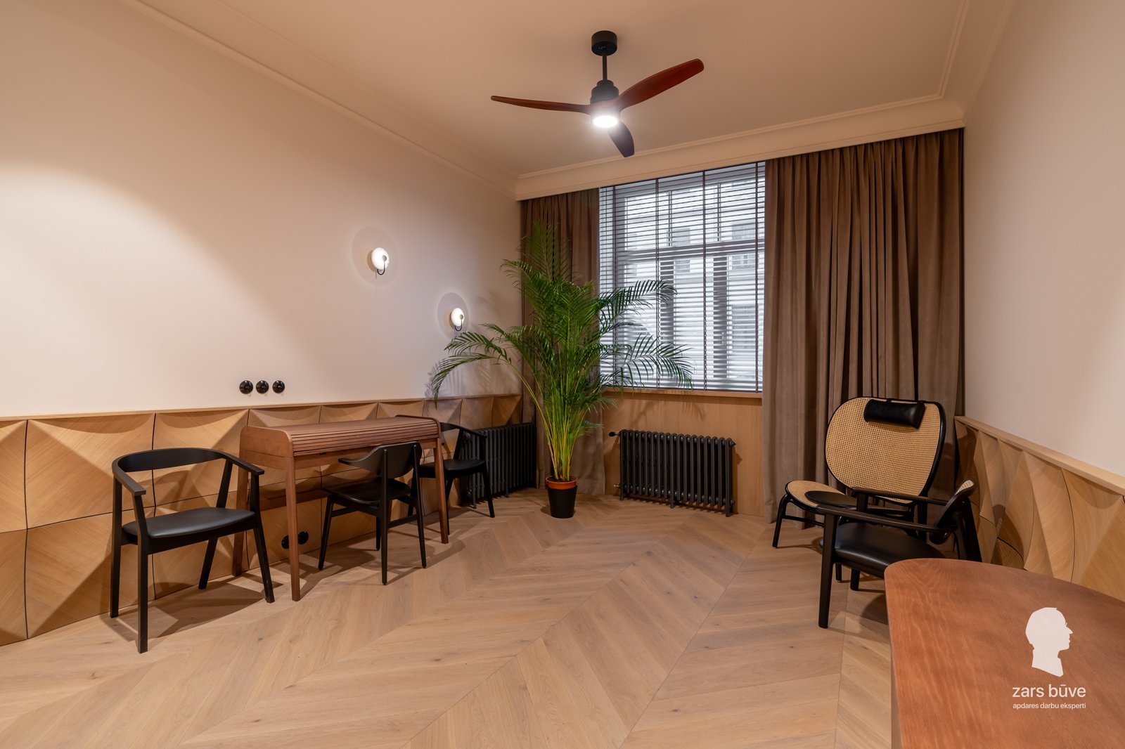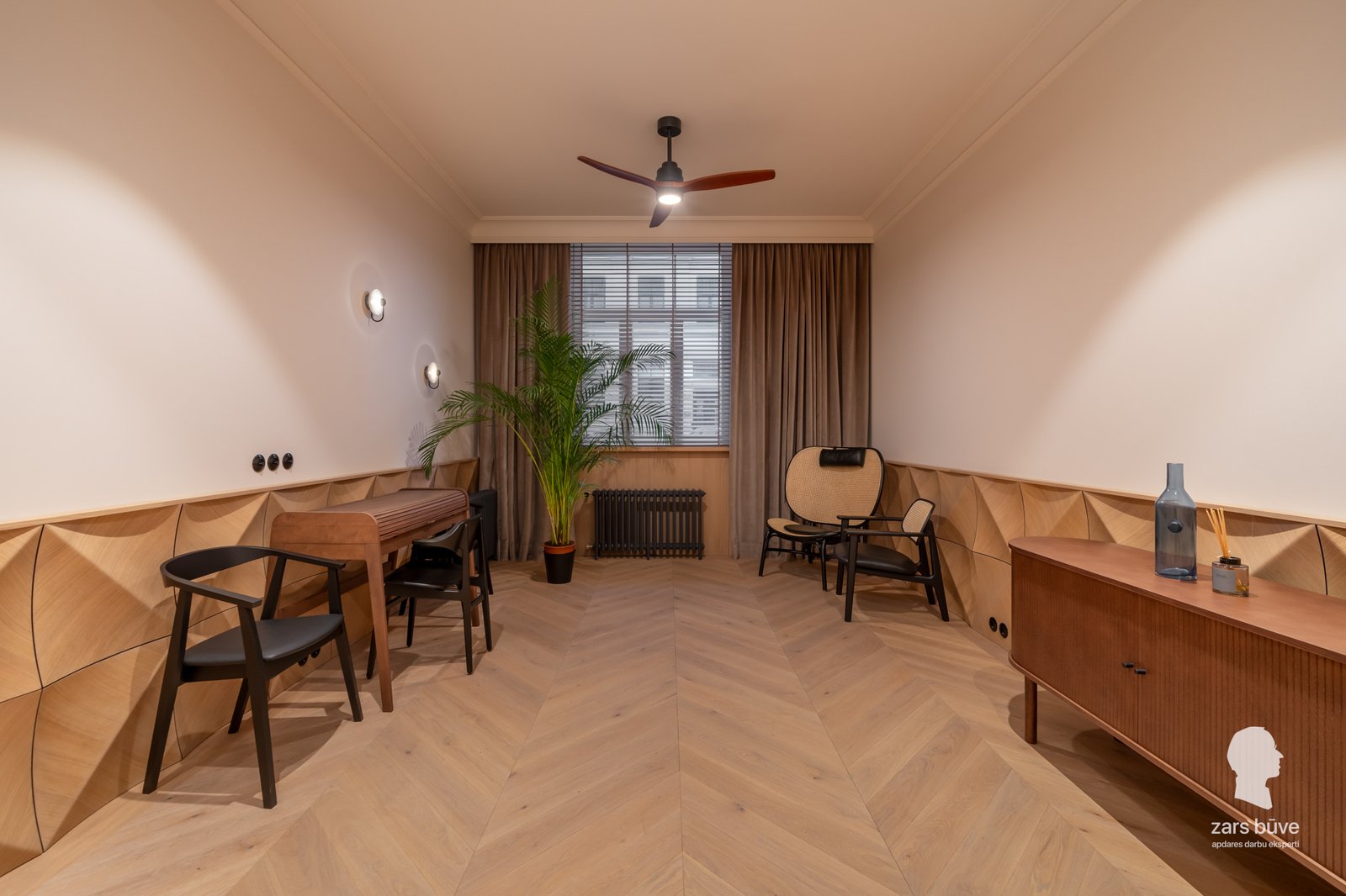 Dzīvoklī tika veikts kapitālais remonts, radot pilnīgi jaunu iekšējo apdari. Attēlos redzams kabinets, kas ir dzīvokļa īpašnieka darba zona, kurai viņš dzīvoklī atvēlējis vienu istabu. Telpu dizains veidots pārdomāti, rūpīgi izvēloties katru detaļu un interjera elementu. Sienu paneļi, kas it kā saplūst ar pieskaņotas krāsas grīdas segumu, telpā rada mierīgu, siltu un pat omulīgu atmosfēru, kas vienlaikus ir pietiekami atturīga un neitrāla, lai netraucētu un ļautu koncentrēties darbam.