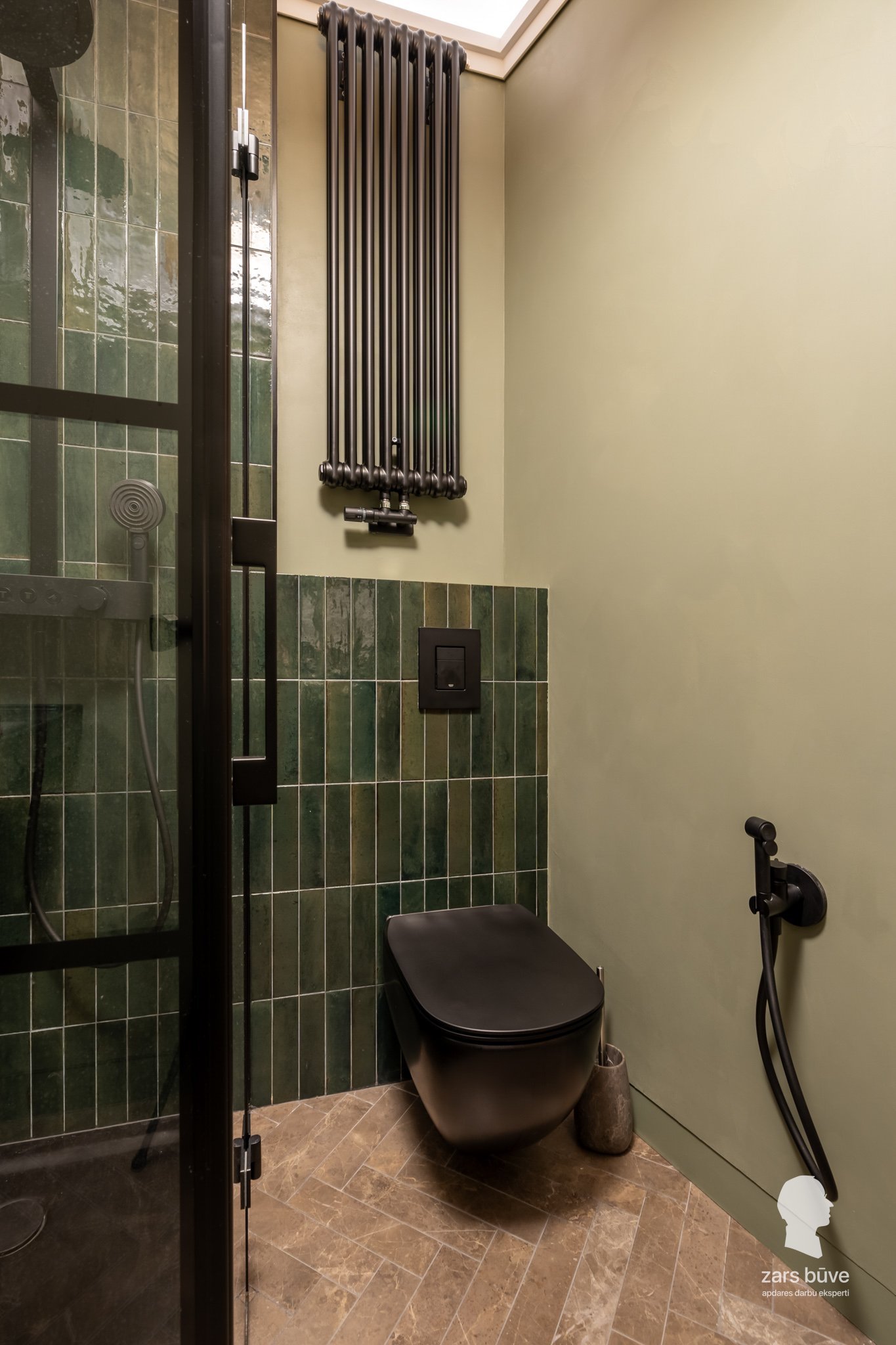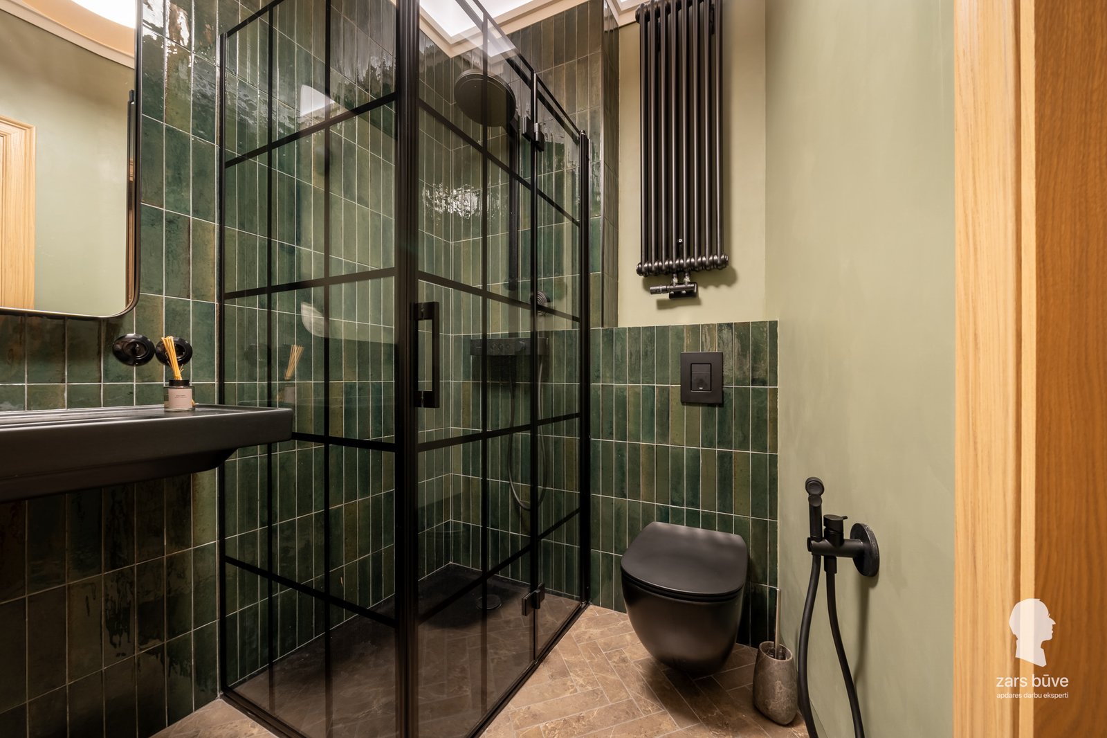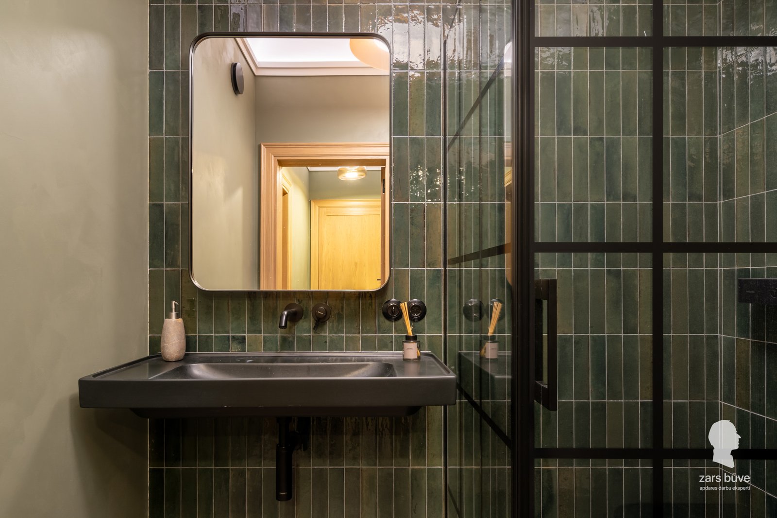 Dzīvoklī tika veikts kapitālais remonts, radot pilnīgi jaunu iekšējo apdari. Attēlos redzams kabinets, kas ir dzīvokļa īpašnieka darba zona, kurai viņš dzīvoklī atvēlējis vienu istabu. Telpu dizains veidots pārdomāti, rūpīgi izvēloties katru detaļu un interjera elementu. Sienu paneļi, kas it kā saplūst ar pieskaņotas krāsas grīdas segumu, telpā rada mierīgu, siltu un pat omulīgu atmosfēru, kas vienlaikus ir pietiekami atturīga un neitrāla, lai netraucētu un ļautu koncentrēties darbam.